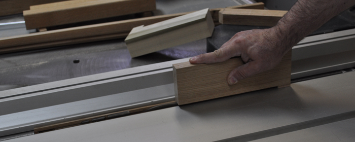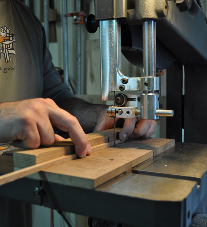 Lots and lots of little dowels "pegs" are used when making Arts and Crafts furniture. I enjoy making my own pins, because, as I said earlier, I enjoy picking up a hammer and pounding the crap out of something– albeit a gentle, controlled pounding. In this post I'll show you how to prepare for pounding, perform the actual pounding and post-pounding steps. I'll also cover some design variables you should be aware of. So get out your hammer and lets go warm up for this task with some traditional woodworking– milling the stock for the pegs. Begin by cutting Square rough stock on the tablesaw. The dimensions should be just a lit bit over the diameter of the final pin size. I use a solid wood push block, and raise the blade only slightly above the stock to minimize any safety risks