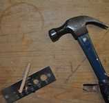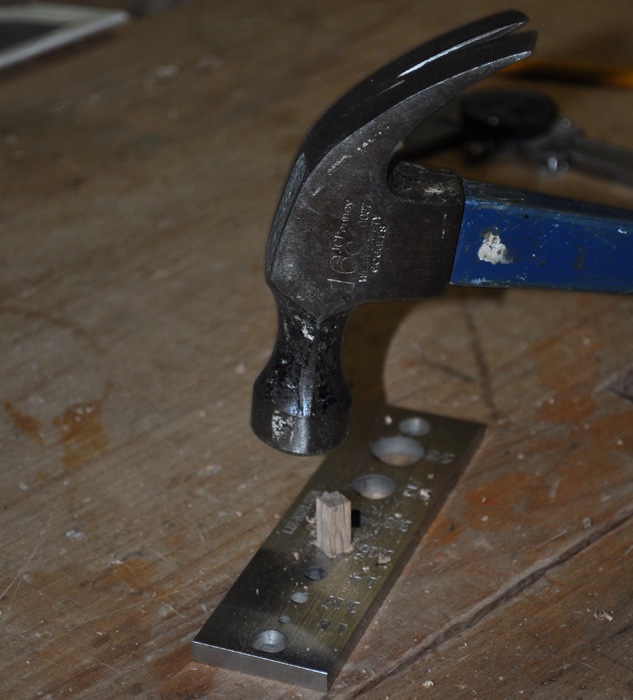 Next I shape the pin–this is the fun, beating the crap out of something part! I use a Dowel Plate for this step. Simple insert the sharpened end and grab your hammer.