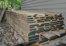 Next I did the same furthest & closest checks on the second layer of boards. The board farthest from the out-building’s wall measured 11.5% (surface check) and 14.5% (interior check) and the board closest to the out-building measured 14.5% (surface check) and 16.5% (interior check). At this point I realize there appears to be variations from top-to-bottom, and front-to-back of my stack that is likely being caused by having one side of my stack closed-off by the out-building wall; locating the stack in the woods is probably not helping either. To help even out these variations I’m going to re-stack the lumber. I’ll move the lumber on the bottom to the top, and on each layer I’ll move the wood closest to the out-building to be furthest from the building.