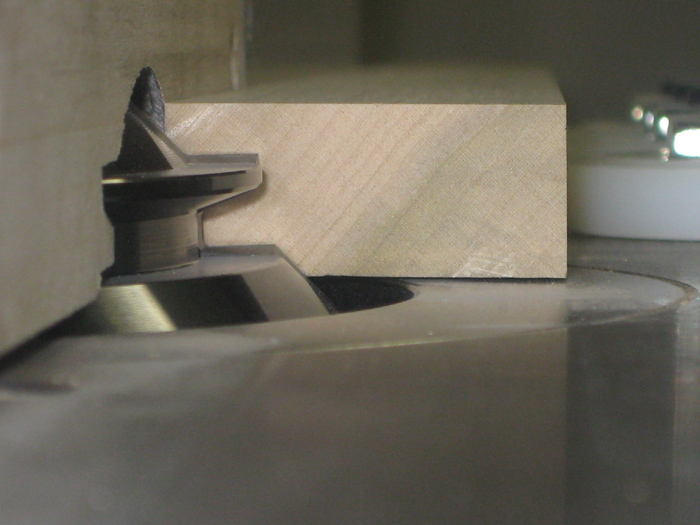 To begin, make a trail cut of the bit height, by feeding a piece of stock through horizontally (Photo 4 and 5).