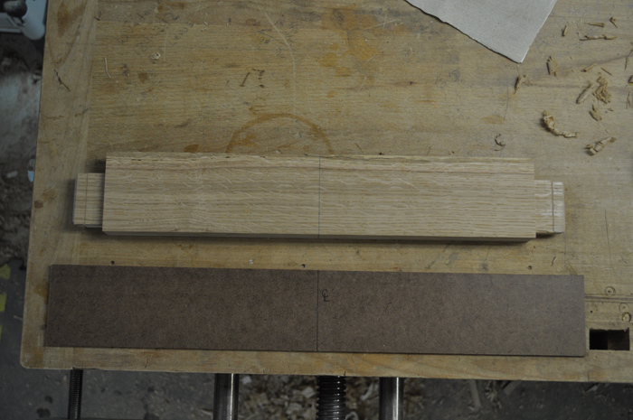 In the photo above I’m using the flat horizontal surface of the workbench and the vertical surface of my vise-block to register the template to the stock. I confirm my alignment by visually ensuring the center-line laid out on the template and stock match up.