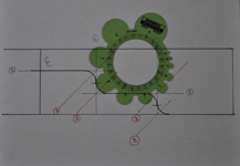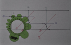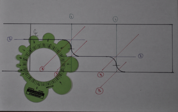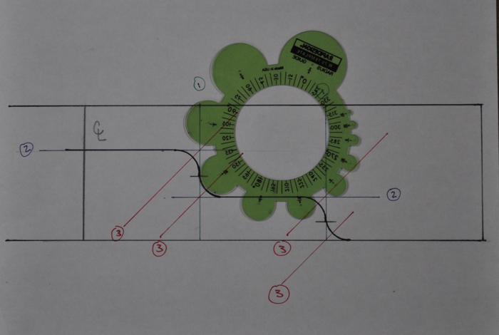 If your creating the shape on the template blank, Image 3, 5 & 6 illustrates how to layout a radius on the template. First I draw a series of layout lines. Line 1 and line 2 represent vertical and horizontal cross hairs of where you want the radius located. Line 3 intersects this point at 45 degrees and is used to align a radius template, which is than used to trace out the curve. An excellent reference on this procedure is Chapter 10: The Cloud Lift Detail of Darrell Peart’s Book Greene & Greene: Design Elements for the Workshop