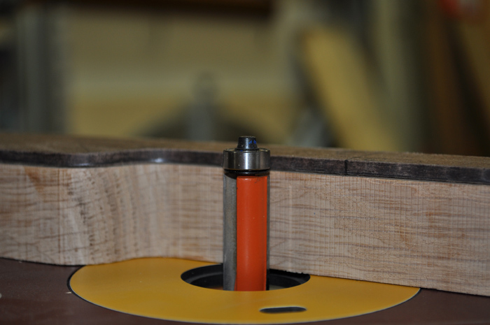 Finally, I flush trim the stock using a flush-trim bit with a guide bearing riding against the template. Be aware of how the grain flows on your stock, and understand its tear-out potential. Finally, ensure the stock is fed in the correct manner.