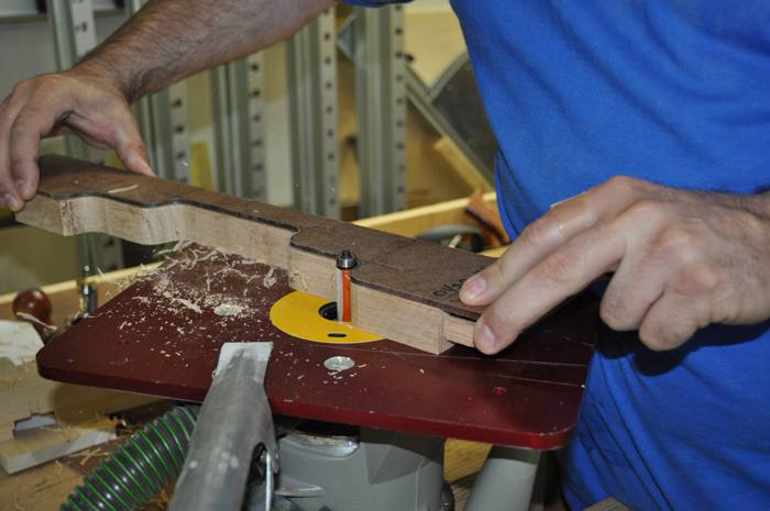 In my work, templates are used for two purposes; the first I call a tracing-template, is for transferring or laying out patterns to stock. This purpose may or may not require the template to be temporarily attached to the stock. Guiding-templates are employed to guide the bearing of a flush-trim bit. This operation requires a more robust template that can withstand the stresses of multiple application and removals, while providing a healthy edge to register a flush-trim bearing.