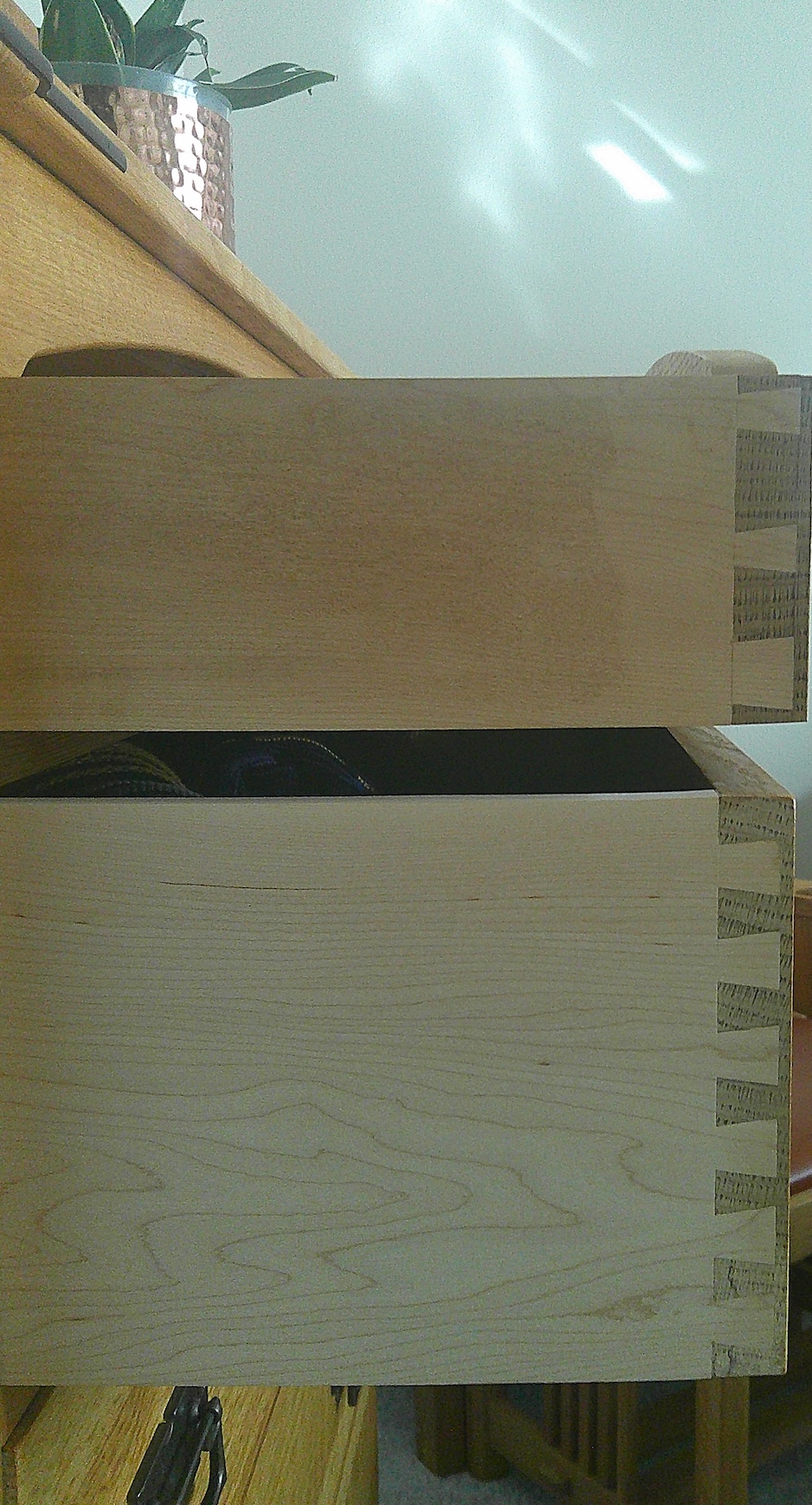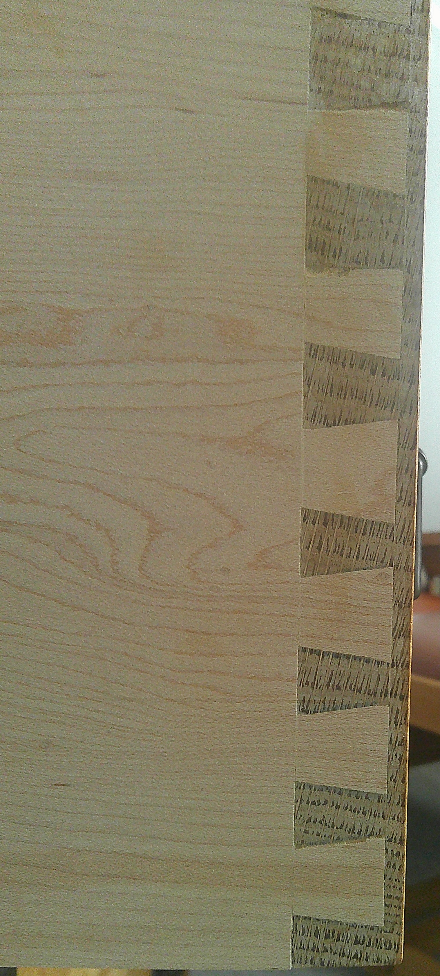 - Non “template” geometry. Hand-cut tails and pins rarely repeat exactly from one corner to another; machine-cut dovetails, by contrast, are mechanically regular, with all pins and tails the same width and evenly spaced like a router jig pattern.