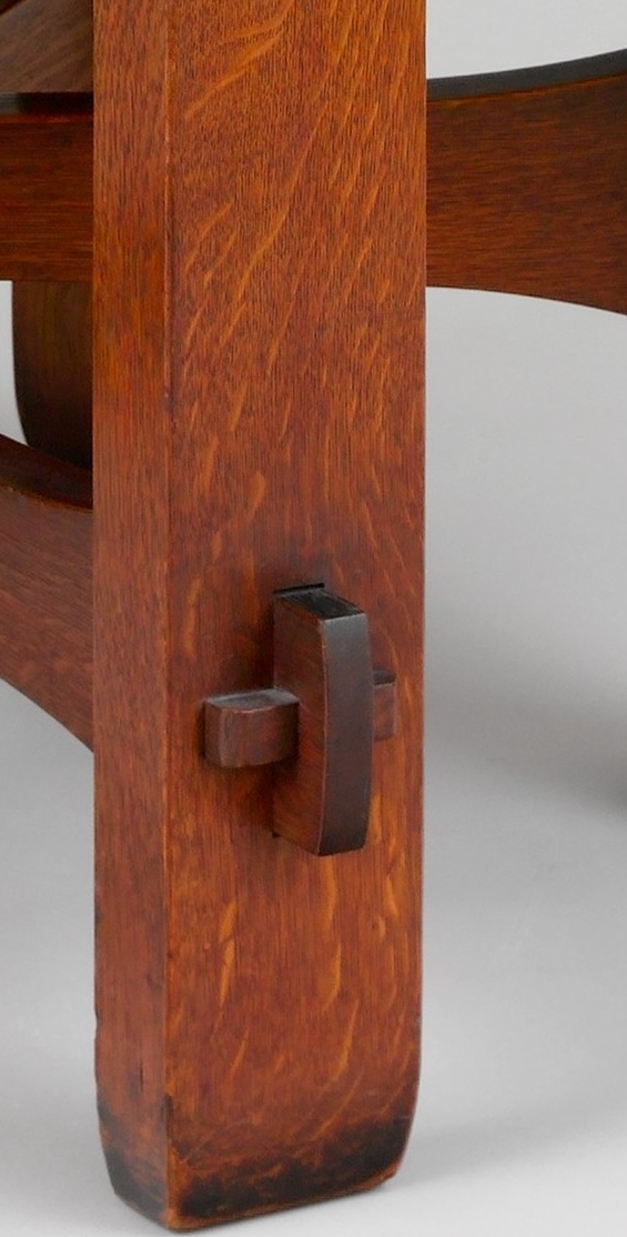 - Mechanical locking features. Many legitimate Stickley and related pieces use pinned or keyed through-tenons—round or square pegs driven through, or a wedge key passing through a slot in the tenon—where the pin/key clearly passes into the tenon, not just a shallow surface plug.