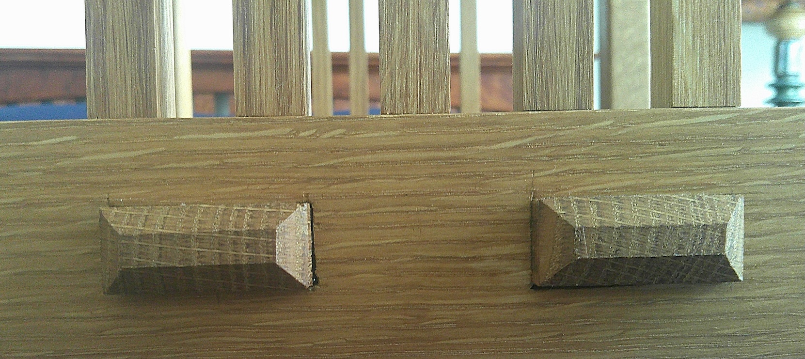 - Thickness and depth consistent with scale. A real structural tenon has enough “meat” to make sense for the span and load of the rail; faux tenons are often suspiciously thin, shallow, or randomly placed where a real joint would be structurally awkward.