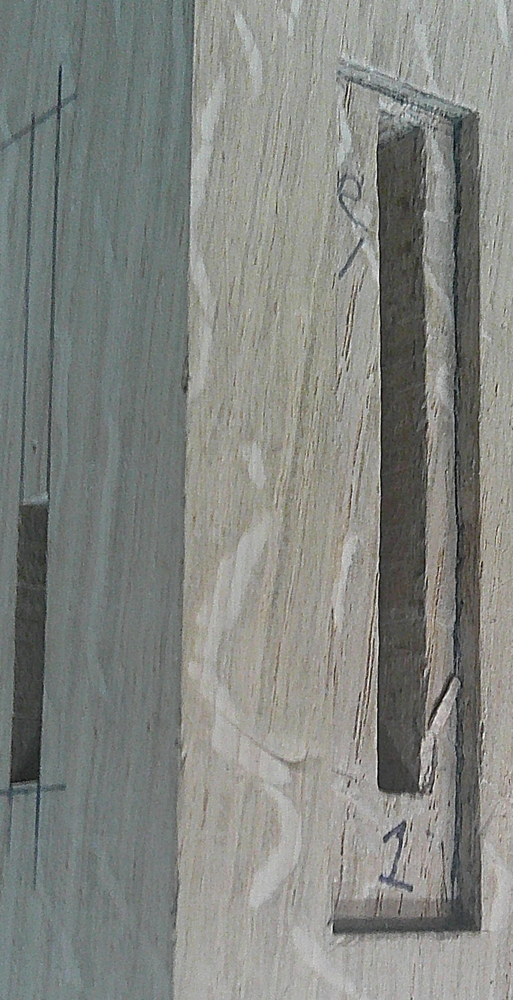 If you see a “tenon” surrounded by a fine glue line on all four edges, with no visible shoulder transition and no sign of compression around any peg hole, it is likely an applied block rather than a real through-tenon.