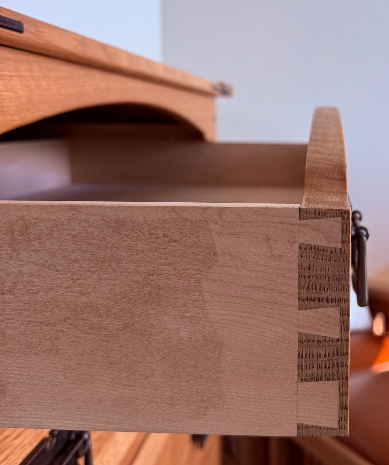 - Slightly irregular baselines. You may see faint scribe or gauge lines parallel to the drawer front, saw overcuts just past the baseline, or tiny chisel bruises in the corners where the waste was chopped by hand.